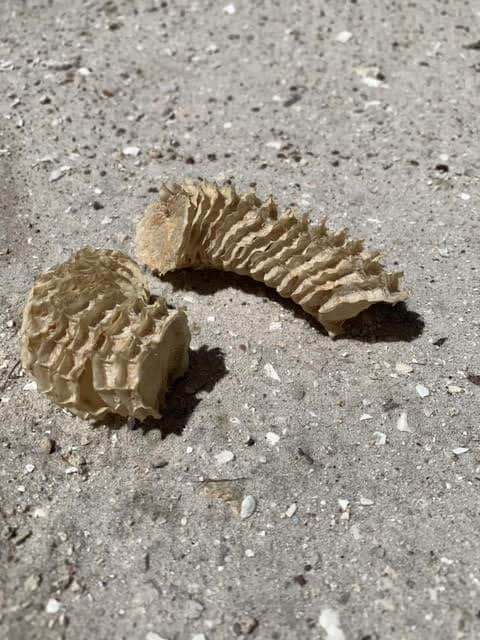 The snake skin-like appearance of this common beach find can be very misleading. These long, curly clusters are actually egg casings from a gastropod called the lightning whelk. Many people are familiar with lightning whelks, a marine snail with a distinct lightning bolt pattern. Female individuals can reach almost 16 inches in length. Lightning whelks are also one of the rare “left-handed” snails, meaning they spiral in a counterclockwise direction with their aperture, or opening, to the left. But what may come as a surprise is how the female whelk lays its string of eggs in such an intricate casing!
