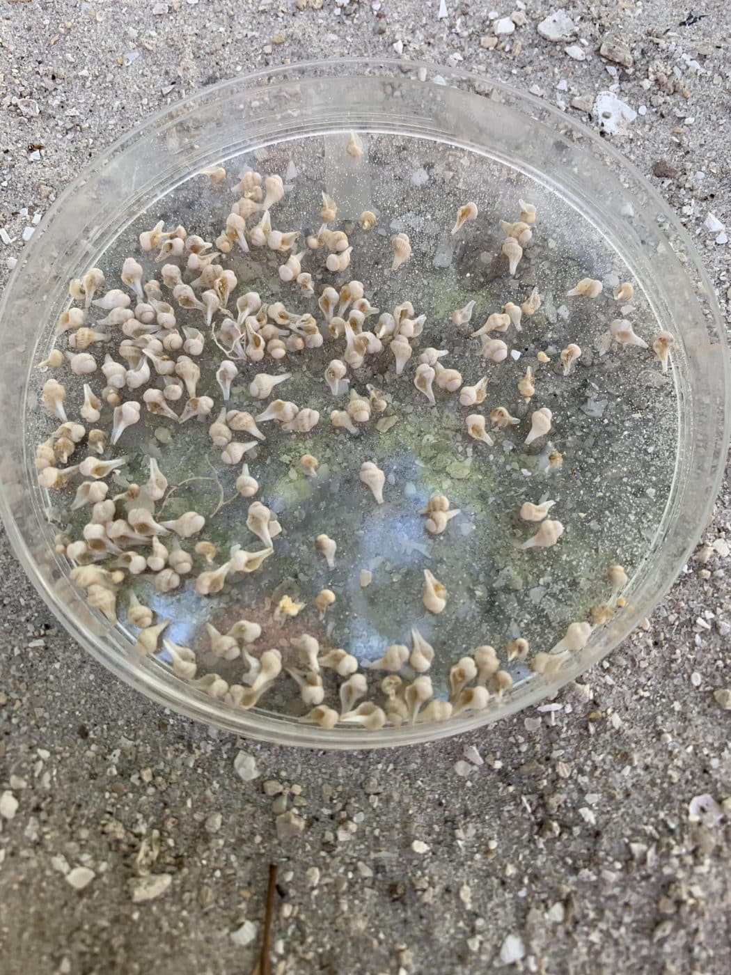 When the juvenile lightning whelks are ready to brave the ocean on their own, they poke through the pouch and crawl through to begin their journey. These whelks will grow and repeat the life cycle – some of them will lay egg casings of their own! The remaining egg casing will eventually detach from the sand and drift ashore. So next time you are on the beach and find a lightning whelk egg casing, pick it up and examine it up close. Are there any tiny shells remaining inside?