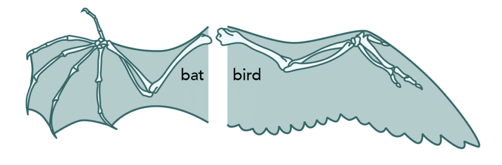 On the opposite side of the spectrum, analogous structures are similar physical features in organisms that do not share a common ancestor. Instead, these structures are related to one another because they perform the same function. An example of this are the wings of a bat and the wings of a bird. They have completely different bone structure, but their wings share the same function, allowing the animal to take flight.