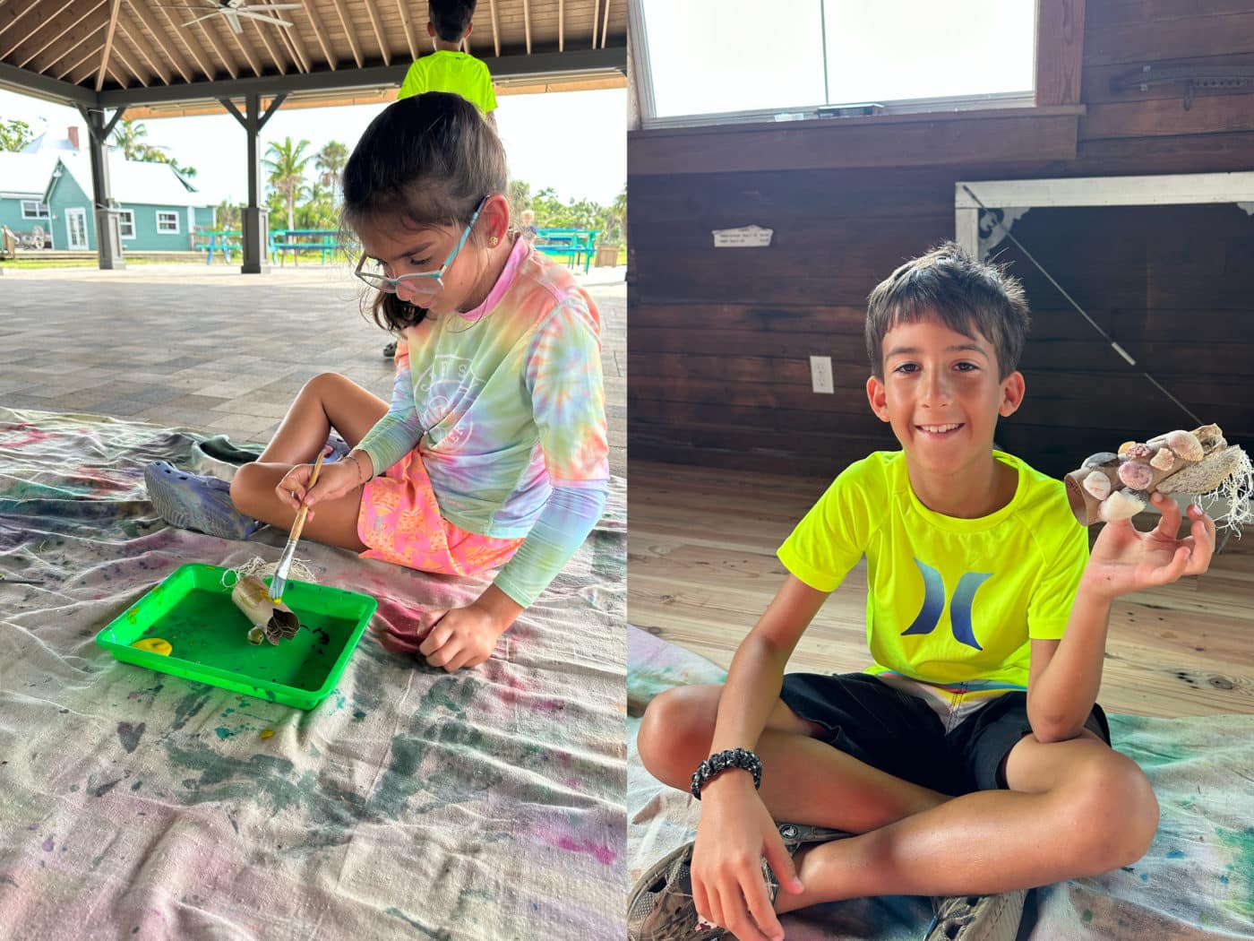 Sanibel Sea School students display their creative art projects at our After-School Ocean Art program. Participants go for a beach walk to collect organic materials washed onto shore. We love getting creative with the natural materials around the island. Sticks, sea grape leaves, shells, sand, coconuts — you name it, we use it!