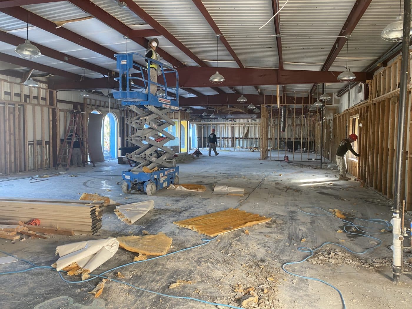 As for the front building, the interior has been completely demolished, cleaned, and the framing is in. The foundation for plumbing is set, and ethernet cables have been hung. Up next — new floors, drywall, electric, tiling, and more!